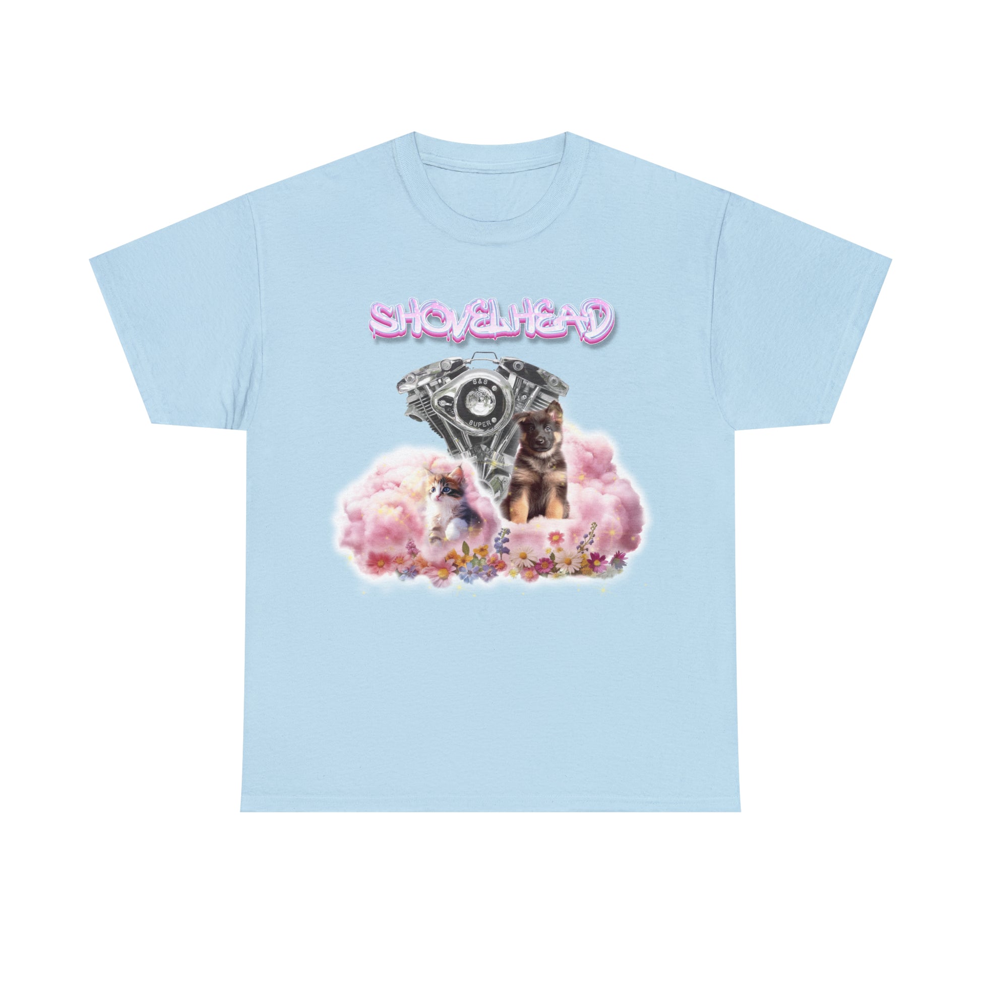 This shirt is a wild fusion of power and cuteness, guaranteed to turn heads and make hearts melt faster than hot asphalt on a summer day. Just picture it: the rumble of a Shovel Head engine, juxtaposed with the sight of precious puppies and kittens bouncing along for the ride. It's a combination that'll make even the toughest biker say, "Aww, that's adorable!"